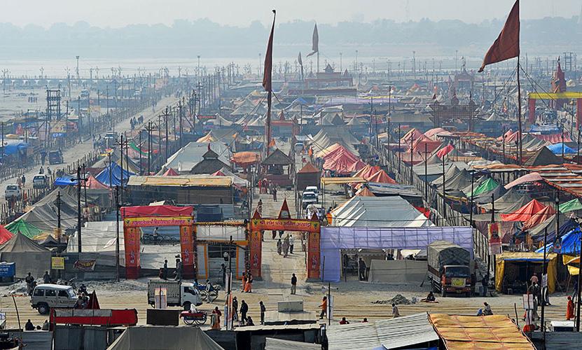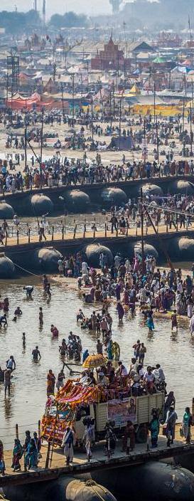 The ancient city of Prayagraj1 lies at the confluence of the three sacred rivers: Ganga, Yamuna and Saraswati, with the last one physically missing2. This meeting point is known as Triveni Sangam. Hindus believe bathing in the ‘holy waters’ will wash away their past sins and release them from the cycle of re-birth. Hence, every twelve years religious rites are performed by bathing in the rivers in a festival known as the Maha Kumbh Mela. The festival rotates every three years among four different river-bank cities which are Prayagraj, Haridwar, Nashik and Ujjain3.