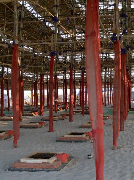 The site is divided into sectors with parcels of land allocated to each religious group who then organise themselves as per their requirements. There were eleven sectors in the 2001 Kumbh Mela which increased to fourteen in the 2013 event. The physical structure of the temporary city is made using elementary lightweight materials like bamboo and ropes (See, Fig.6.2). The assembly of the city and its subsequent disassembly is therefore an efficient process. These ‘material technologies’ (Mehrotra et al., 2015, p.86) of the settlement make it easier for the administration and the local labour to build ancillary services within a specific period. The tents made for this event are multi-scalar units. They are used for various purposes besides sleeping like performing religious rituals, congregating people for religious discourses and cultural events and hospitals interspersed by public toilets (Mehrotra et al., 2015, p.278) (See, Fig.6.3,6.4,6.5). There are open spaces in each akhara (ascetic camp) which are appropriated by people who do not have tents for sleeping.