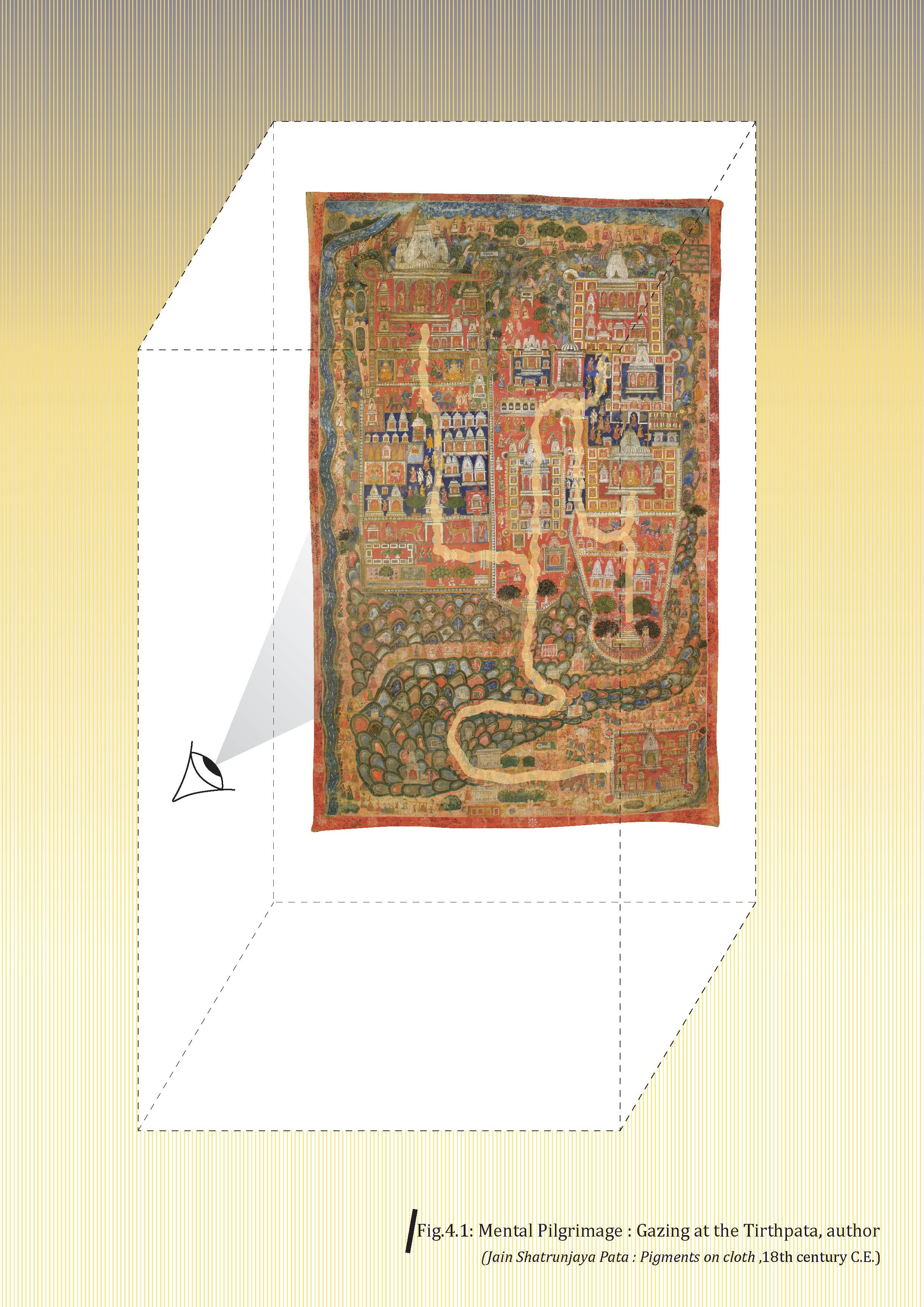 Narrative mapping was a common practice in India before the introduction of Western cartography. Often, these were pictorial translations of a poem or story. The artists would depict the topography of the place along with its ‘ephemeral and emotive aspects’ (Khera, 2020, p.15). Indian map-making also included the production of pilgrimage maps called ‘Tirthpatas.’ Gazing at this map was an act of a pilgrimage. These were ‘mental pilgrimages’ (Goswamy, 2023) (See, Fig.4.1) undertaken by devotees who were unable to go on a physical one. None of these maps was drawn on a uniform scale. The focus of these maps was on the sensorial experience of place1. This mode of mapping was made with ‘place-centric imagination’ (Khera, 2020, p.24) and ‘localising of moods’ (Khera, 2020, p.173) of the place.