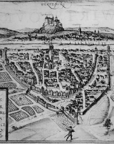 Fig.3.1: Dialogue between European and Indian map-making techniques. The view of the image on the left resembles the view on the right due to influence of Western cartography, yet the local sensibilities were considered while representing . (on left) Pictorial representation of Daulatabad during Mughal reign (on right) Map of Wurzburg Source : Koch, 2012