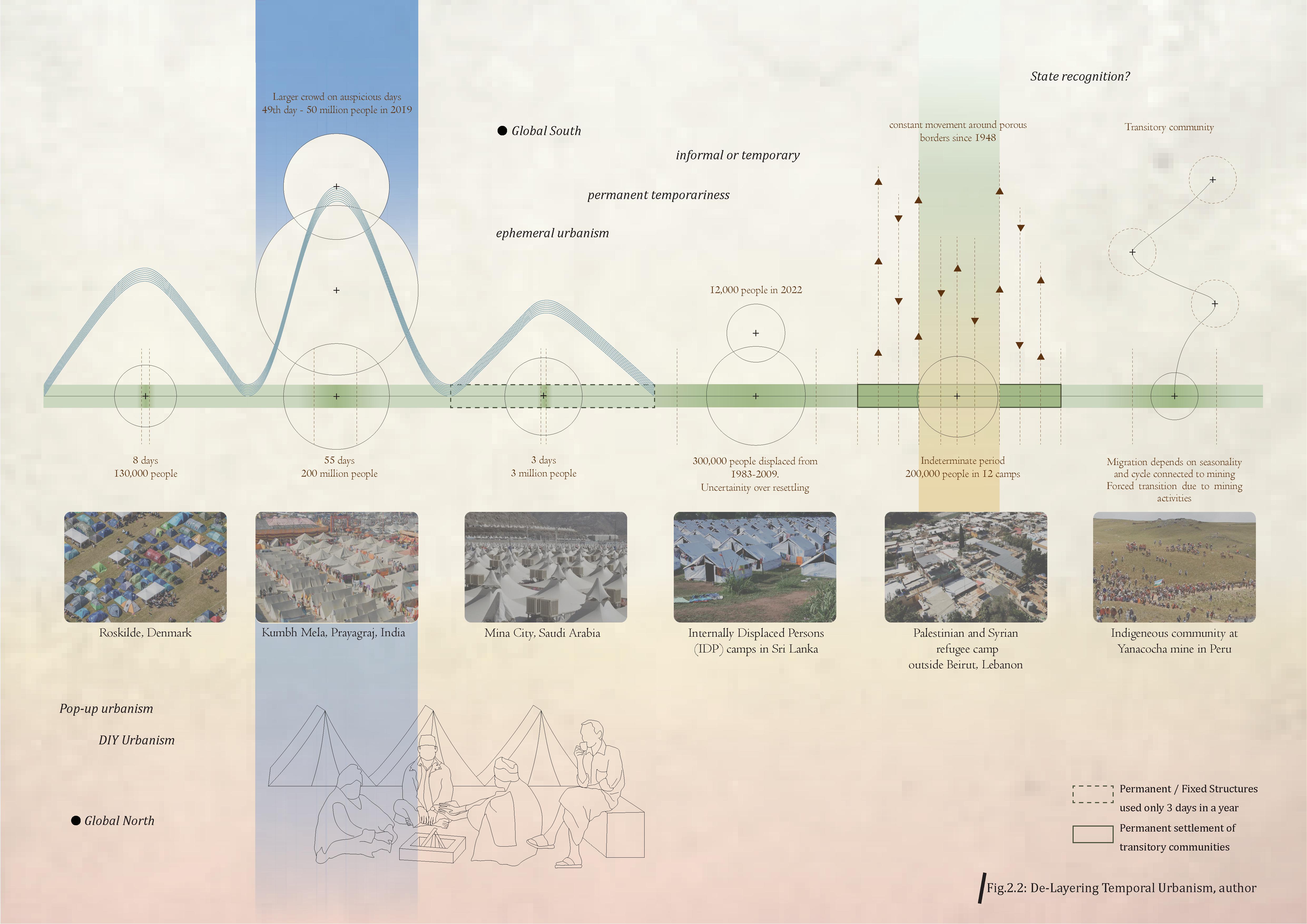 Temporal cities in the ‘Global South’ provide a wide range of examples where temporariness is redefined based on topography, socio-political context and cultural practices. The book, ‘Transforming Cities through Temporary Urbanism’ (Andres and Zang (Eds.), 2020) cites cases of temporal settlements in the Southern context and their role in the place-making process. Moawad (2020) describes the camps built by Palestine and Syrian refugees living on the outskirts of Beirut who are in a constant state of limbo. The refugees use their collective experience of ‘waiting’ to develop ‘specific place-making practices (p.73). These strategies create ‘temporal-spatial alternatives’