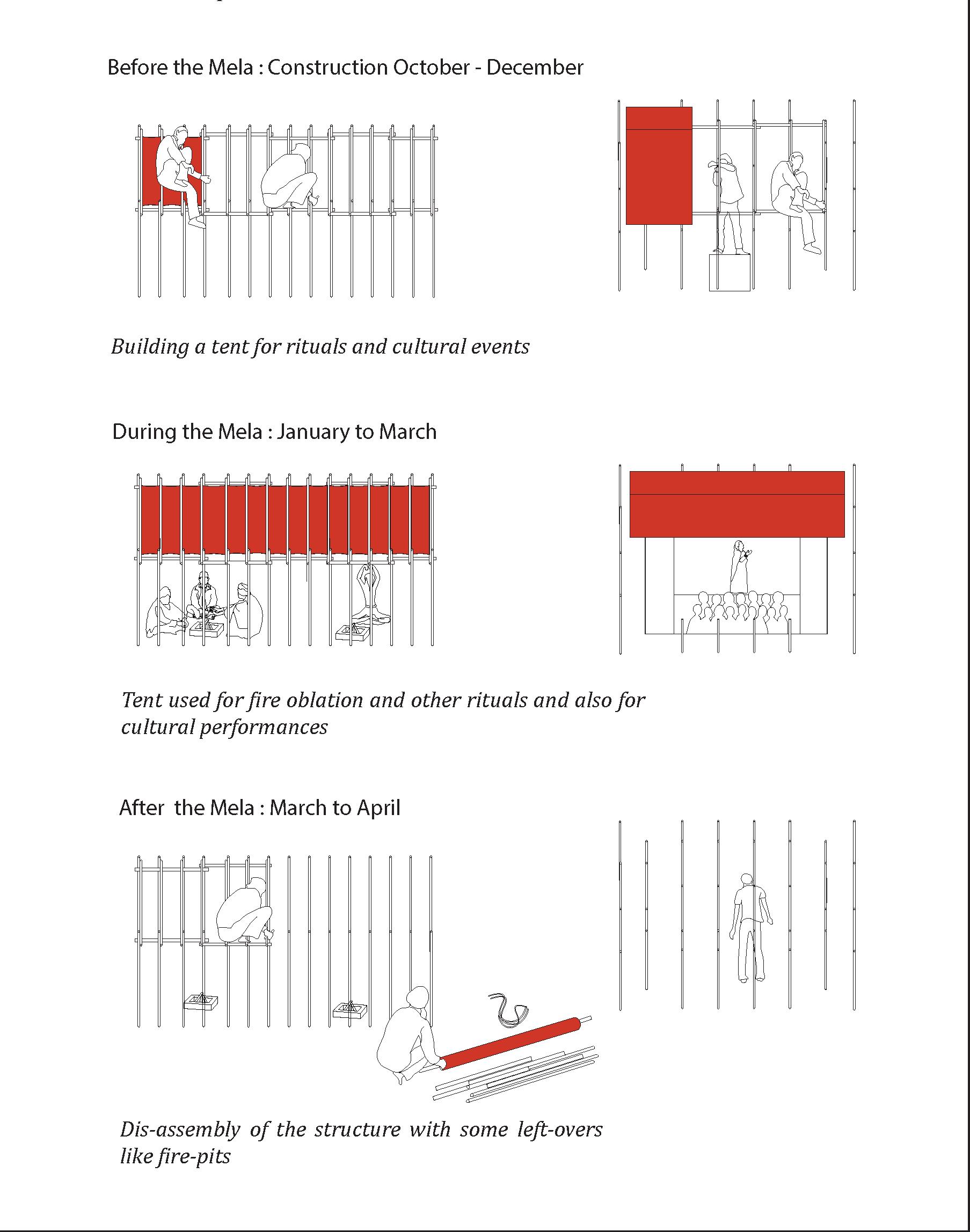 The second part - SITE will elaborate on the site and its distinctive features. Chapter 5 details a documented and perceptive timeline of the festival and the various activities performed on-site. Chapter 6 situates the tent typology within the context of everyday urbanism and illustrates the modularity of the tent and its various uses in the Kumbh Mela.