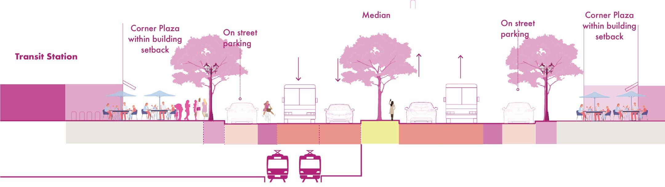 Transit nodes are essential in place making as they must be active, attractive, safe, and accessible. The plaza or the open space that the transit station in R-B opens into is an essential urban element that all the stations have along this corridor. This plaza must be connected by the main streets and has active facades.