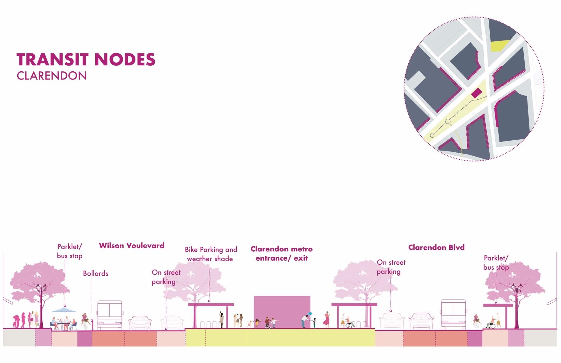 The Clarendon transit stops opens in a plaza that is surrounded with a mixed-used neighborhood. The parklets allow for pop up seatings and transition into on street parking. The plaza caters to bike parking and playground for children