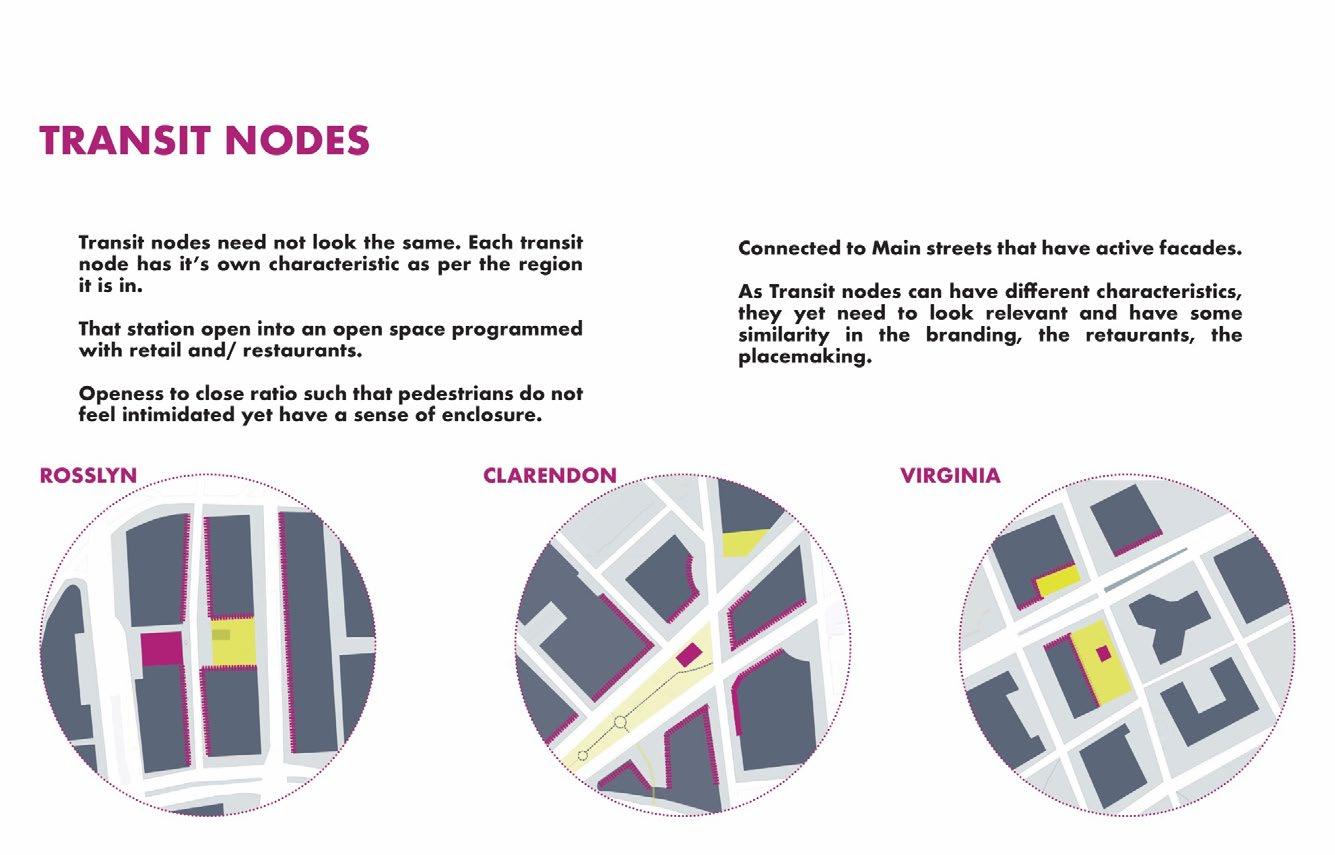 The transit node at rosslyn opens into a plaza. The dedicated bus lane and pickup stops provides opportunity for alternative transit mode. The plaza is surrounded with retail in an office area and shaded with trees that makes it comfortable for pedestrians to meander.