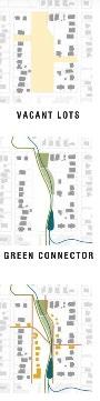 Typical block plan with soak and store strategies to mitigate flooding, create a trail and have diverse housing types.