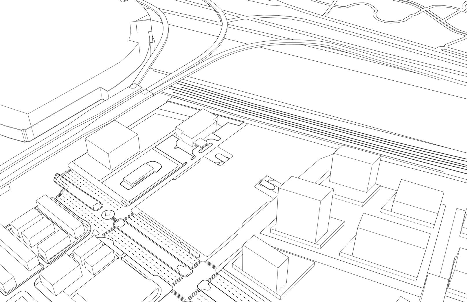 This transition street opens into a public green and is activated by several retail and further transitions into a quieter park surrounded by residential type