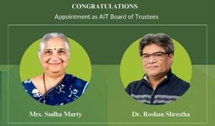 22 August 2024 – The AIT Board of Trustees appointed two new members: Mrs. Sudha Murty, renowned Indian author, philanthropist, and social worker, and Dr. Roshan Shrestha, Deputy Director of the Global Growth and Opportunity Division (Water, Sanitation & Hygiene) at the Bill & Melinda Gates Foundation.