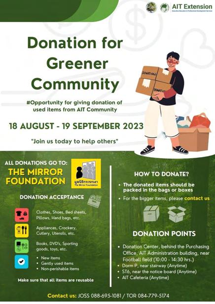 The AIT Extension’s CSR campaign, “Donation for Greener Community,” successfully concluded on September 19, 2023, having run from August 18, 2023. The campaign aimed to promote sustainability and reduce environmental waste by encouraging the AIT community to donate unused items to those in need.