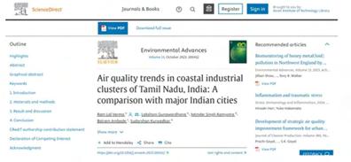Description: A peer review research article on “Air Quality Trends in Coastal Industrial Clusters of Tamil Nadu, India: A Comparison with Major Indian Cities” was created by RRC.AP, Air Pollution Cluster and was published online by Environmental Advances in October 2023.