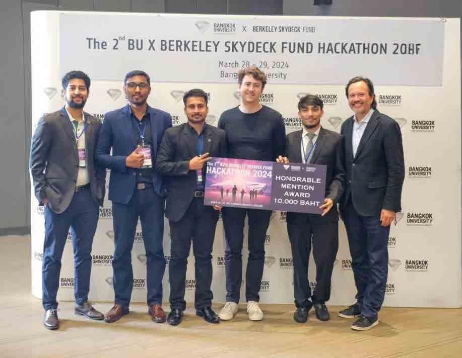 In a remarkable display of talent and innovation, four students from the School of Engineering and Technology (SET) at the Asian Institute of Technology (AIT) displayed their skills at the 2nd BU X Berkeley SkyDeck Fund Hackathon 2024 at Bangkok University. Their outstanding performance earned them the prestigious Honorable Mention Award on 29 March 2024. The team, “Excel in Stone,” comprised of Binay Karna, Rahul Kasaudhan, and Muhammad Hammad from the Structural Engineering Program, and Tungish Uprety from Water Engineering and Management, was selected in the top 10 among 100 teams from 20 different countries.