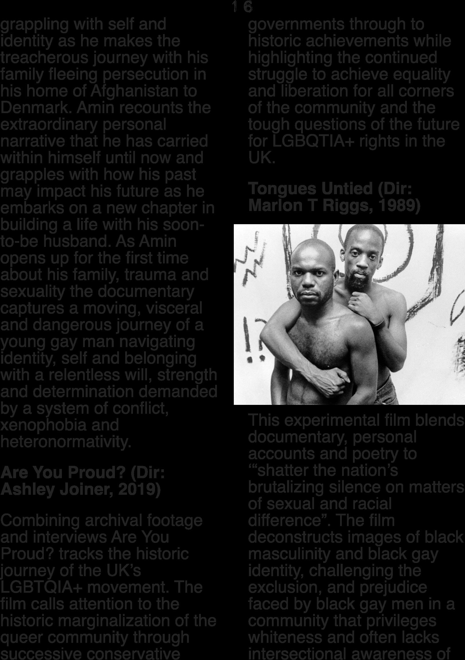 race and sexuality. The film addresses the hypersexualisation of black men for the purposes of white pleasure while addressing the ‘silence’ placed upon black gay man due reinforced by the intersections of patriarchial masculinity, racism and homophobia. The radical use of music, poetry and dance articulates the experience of black gay masculinity in the late 80s’ that remains relevant today.