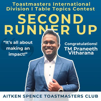 Our club’s spirited and enthusiastic EXCO members and our teamwork have been the cornerstone of our success, making Aitken Spence Toastmasters a shining beacon of inspiration. I would also like to extend my heartfelt congratulations to TM Praneeth Vitharana for his impressive achievement as the 2nd Runner-Up in the Table Topics Contest at the Division Level.