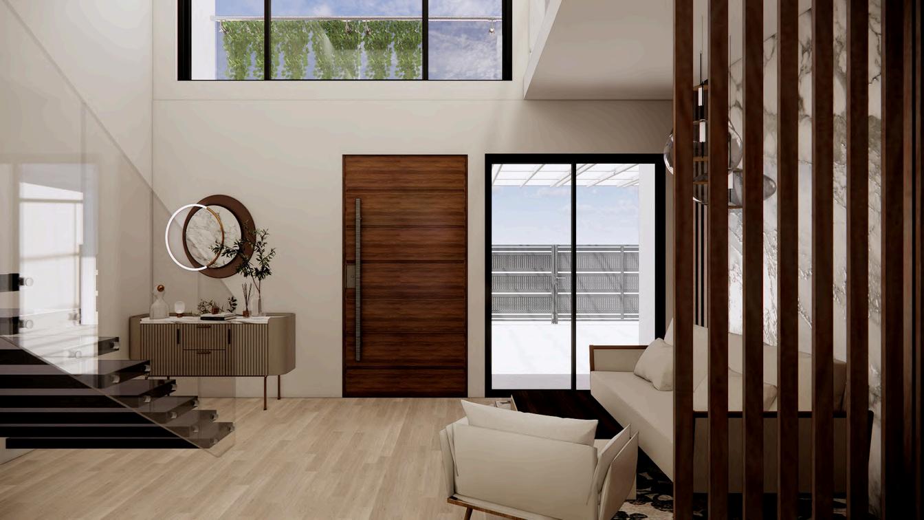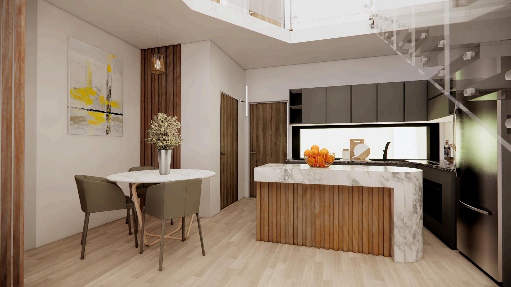 mid-century modern yang akan memberikan kesan hangat dan natural Selain itu, penggunaan cesca chair pada area dining menambah karakteristik interior mid-century yang timeless