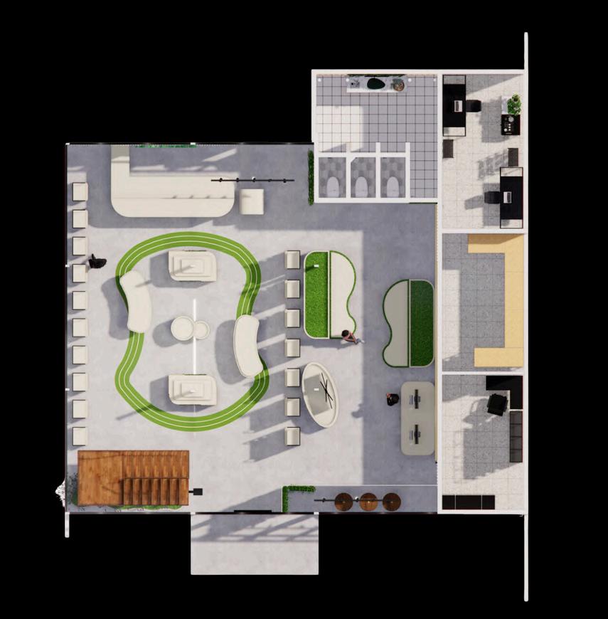 Lantai satu dari retail skincare in diis oleh area display untuk skincare, pada display bagian tengah ditujukan untuk memajang best seller skincare dan newest products dari innisfree sendiri Sedangkan rak disp ay yang berada d kanan dan kiri reta l store ini dijadikan sebaga disp ay skincare sesuai dengan bahan baku dari skincare tersebut yang merupakan ciri khas dar innisfree Pola antai yang mel uk ter nspirasi dari perjalanan menuju gunung yang berada di Pulau Jeju Sedangkan aksen-aksen kayu pada dinding dan plafon, serta bentuknya yang seperti bukit terinspirasi dari kekayaan pegunungan Jeju, Jeju merupakan tempat terciptanya produk Innisfree