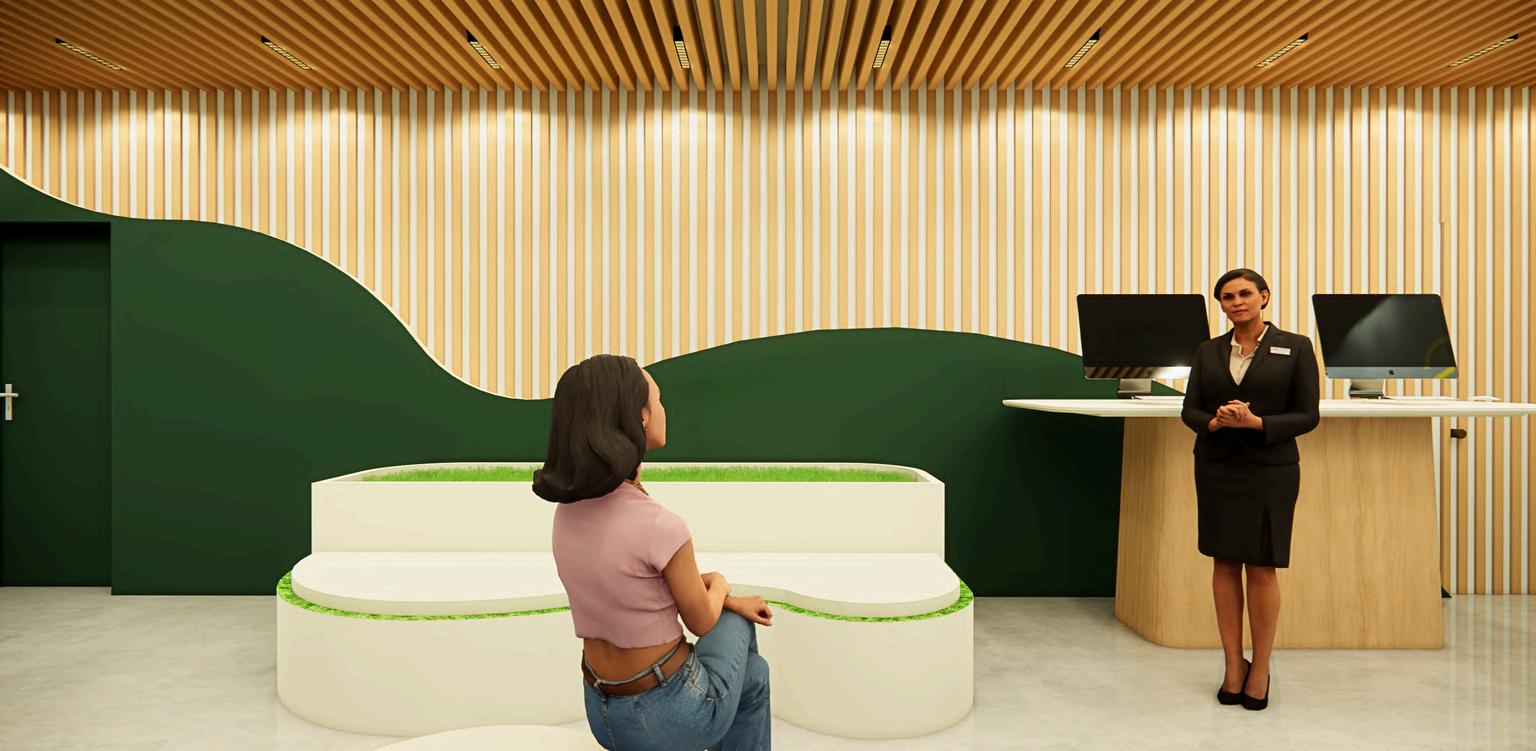 Di sebelah kanan setelah entrance terdapat sebuah area bagi pengunjung untuk melakukan digital experience yaitu pengecekan kondisi kulit Pada kursi tunggunya dibuat dinamis mengikuti pola-pola inter or yang diterapkan pada dinding Pada dinding interior retail ini banyak menggunakan aksen kayu dan tanaman untuk memberikan kesan kepada pengunjung seolah mereka berada d alam Hal ni tentunya disesuaikan dengan visi mis brand nnisfree