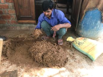 Rice husk infused cowdung plaster - Cowdung from the cattles, rice husk from the paddy fields, earth. The materials sourced from the farm helps plastering the rat trap bond walls of the infrastructure.