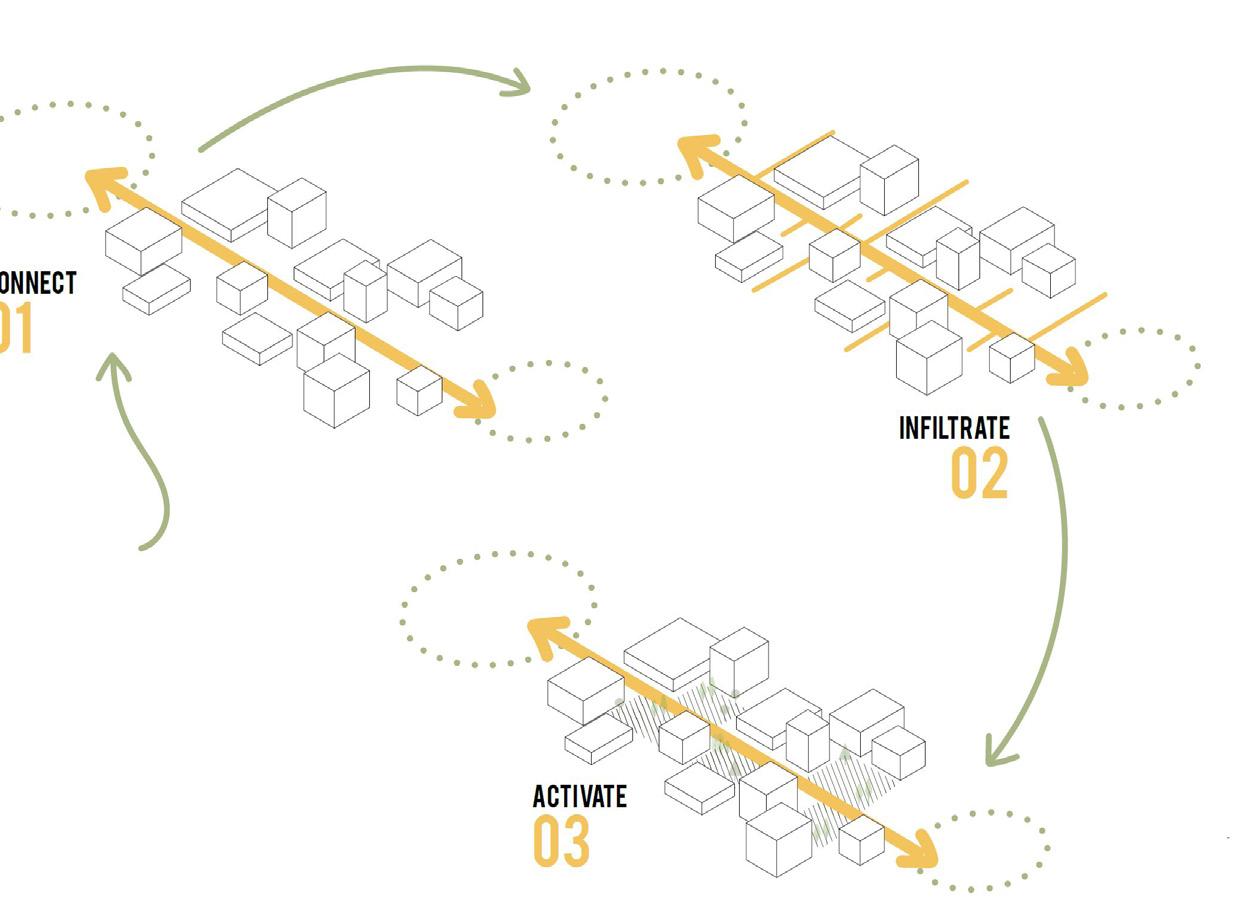 PERIMETER OF THE AREAS OF INTEREST & TWO FOCUS AREAS Focusing on our 2 interested areas, we use a map with 3 main proposals to generate a big picture for readers; Reconnecting, Reassembling, and Redesigning