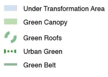 To mitigate the heat and climate impacts, two strategies; traffic heat reduction and cooling mobility & transit are settled. high concentration of air pollution and lack of green space for the second area. The greener & cleaner district aims to address the air pollution and improve the visualscape along the infrastructures. In order to incorperate the urban forest and green spaces in city, the existing circulation and ecosystem are notable for us, we try to maintain the natural system and create the additional least-impact intervention.