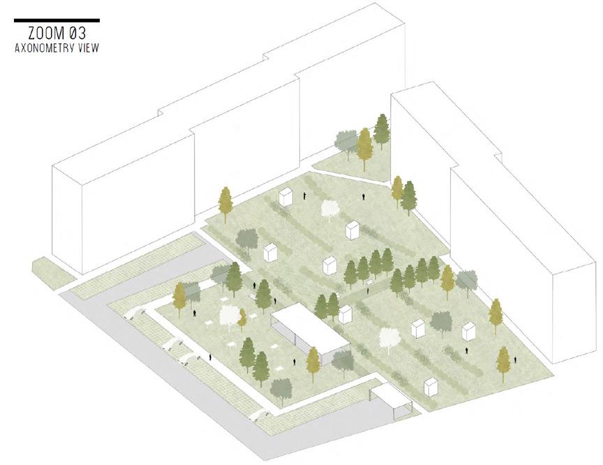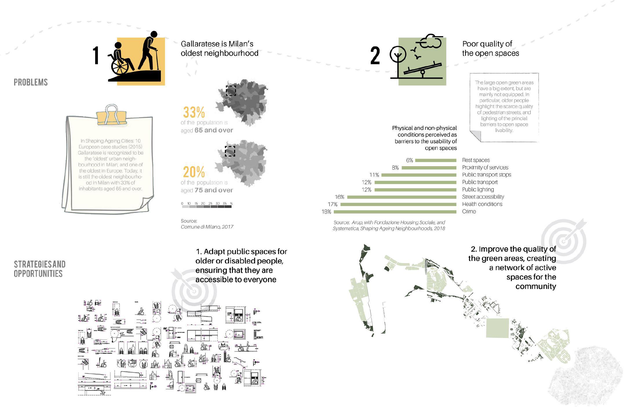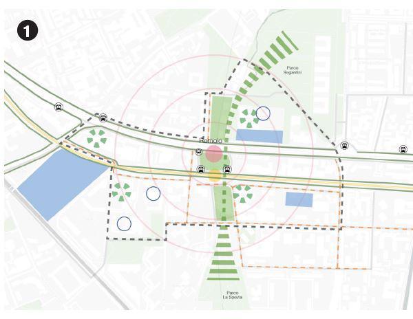 The strategy for interventions at the scale of the Gallaratese neighborhoods based on a central spine, based on public transport and, in part, on Green Ray 7. The idea is to identify the green spaces along this route, often large and unequipped areas, giving them a connotation and transforming them into a real Green Ray for the neighborhood and the city.