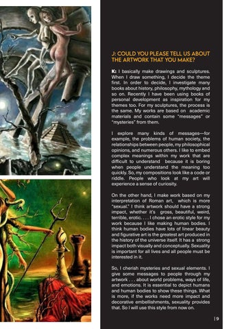 J: COULD YOU PLEASE TELL US ABOUT THE ARTWORK THAT YOU MAKE? K: I basically make drawings and sculptures. When I draw something, I decide the theme first. In order to decide, I investigate many books about history, philosophy, mythology and so on. Recently I have been using books of personal development as inspiration for my themes too. For my sculptures, the process is the same. My works are based on academic materials and contain some “messages” or “mysteries” from them. I explore many kinds of messages—for example, the problems of human society, the relationships between people, my philosophical opinions, and numerous others. I like to embed complex meanings within my work that are difficult to understand because it is boring when people understand the meaning too quickly. So, my compositions look like a code or riddle. People who look at my art will experience a sense of curiosity. On the other hand, I make work based on my interpretation of Roman art, which is more “sexual.” I think artwork should have a strong impact, whether it’s gross, beautiful, weird, terrible, erotic. . . . I chose an erotic style for my work because I like making human bodies. I think human bodies have lots of linear beauty and figurative art is the greatest art produced in the history of the universe itself. It has a strong impact both visually and conceptually. Sexuality is important for all lives and all people must be interested in it. So, I cherish mysteries and sexual elements. I give some messages to people through my artwork . . . about world problems, ways of life, and emotions. It is essential to depict humans and human bodies to show these things. What is more, if the works need more impact and decorative embellishments, sexuality provides that. So I will use this style from now on. |9