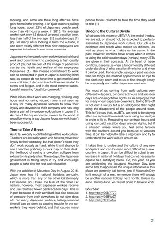 Time to Take A Break As JETs, we only touch the fringe of this work culture. Teachers are not salarymen who have to prove their loyalty to their company, but that doesn’t mean they don’t work equally as hard. While it isn’t strange to see a teacher grabbing a quick nap on their desk, the likelihood of seeing a coworker collapse from exhaustion is pretty slim. These days, the Japanese government is taking steps to try and encourage people to take time for rest and relaxation. With the addition of Mountain Day in August 2016, Japan now has 16 national holidays annually, which is more than any of the other G7 (formerly G8) nations (2). Unlike the bulk of the other G7 nations, however, most Japanese workers receive and use relatively fewer paid vacation days. This is in part because of their workload, but also because of pressure from their coworkers to not take days off. For many Japanese workers, taking personal time off can be seen as causing trouble for the coworkers they leave behind, and that causes many