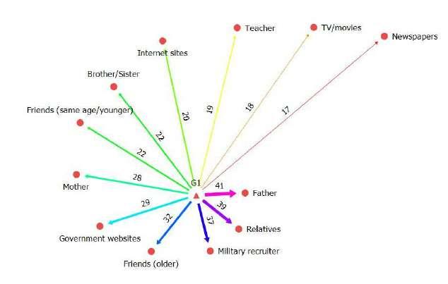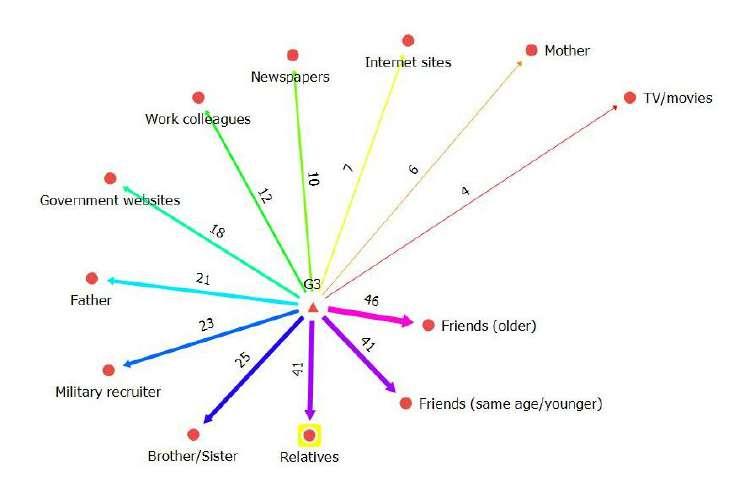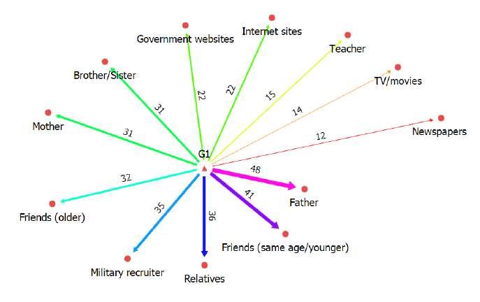 A between group comparison showed that Father and Friends (same age/younger) were information sources used most by Group 1. This finding was consistent with the literature [14] which found that Father and Friends were primary sources for American high school students in military career decision making. In contrast, Friends (same age/younger or older) were information sources used most by Groups 2 and 3. Unlike earlier findings [15], this study found that the older participants’ main information sources were Social and limited to family members (Father, Siblings, Relatives) and close social contacts (Friends peer/older), whereas the younger high school participants’ sources were wider; including Social (Father, Friends, Relatives) and Institutional (military recruiter) sources. It would seem that older participants (Groups 2 and 3) displayed a more targeted information seeking behavior which concentrated on sources most likely to yield relevant and direct information on national service as Siblings, Relatives, Friends who may include service alumni.
