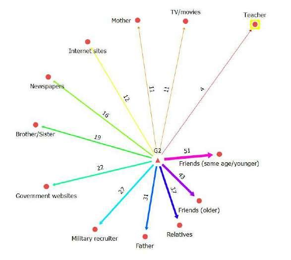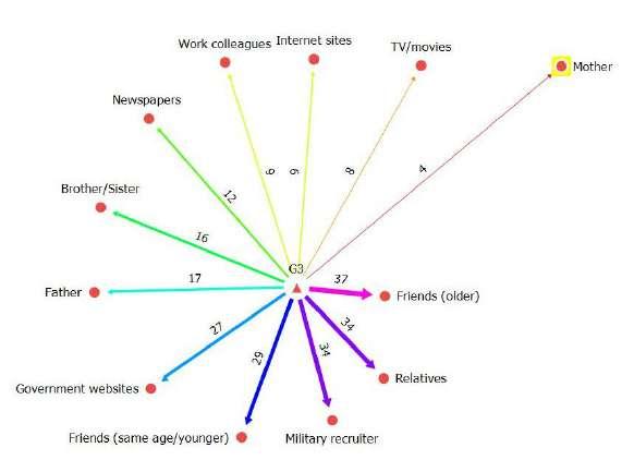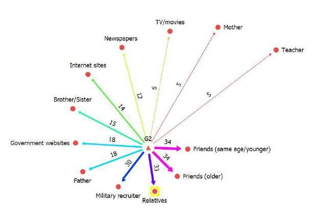Two patterns in the data emerged in the comparison of information sources used by participants and future sources. Across groups, participants would rely on both Social and Institutional sources in future information seeking behavior. Moreover, the Military Recruiter is an emergent information disseminator and would become a more important information source to all groups. From an SNA perspective, it is important to note that there were no Isolates in the networks i.e. nodes with no ties incident to and from it. Given the assumptions that information sources are represented as Receiver nodes and ties are asymmetrical (one way); sent from the group (Transmitter node) to one or more information source, the presence of an Isolate would indicate an unused source which could limit the acquisition of information by groups.