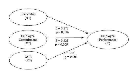 variables (leadership, employee commitment, and OCB) that determine employee performance, the one with the largest coefficient is the OCB variable.The coefficient values of the results of the analysis of the influence of leadership, employee commitment, and OCB on employee performance are presented in Figure 2.