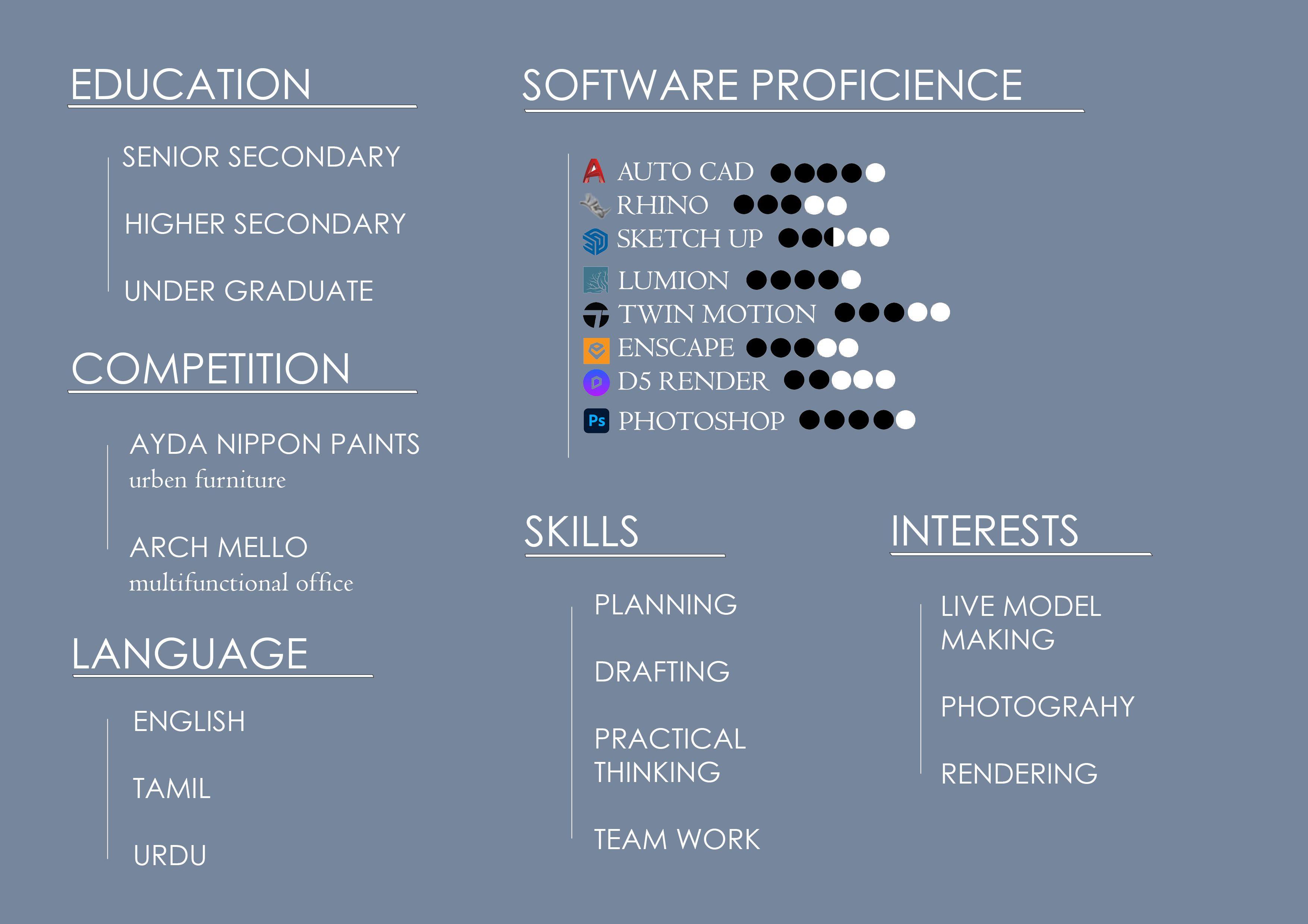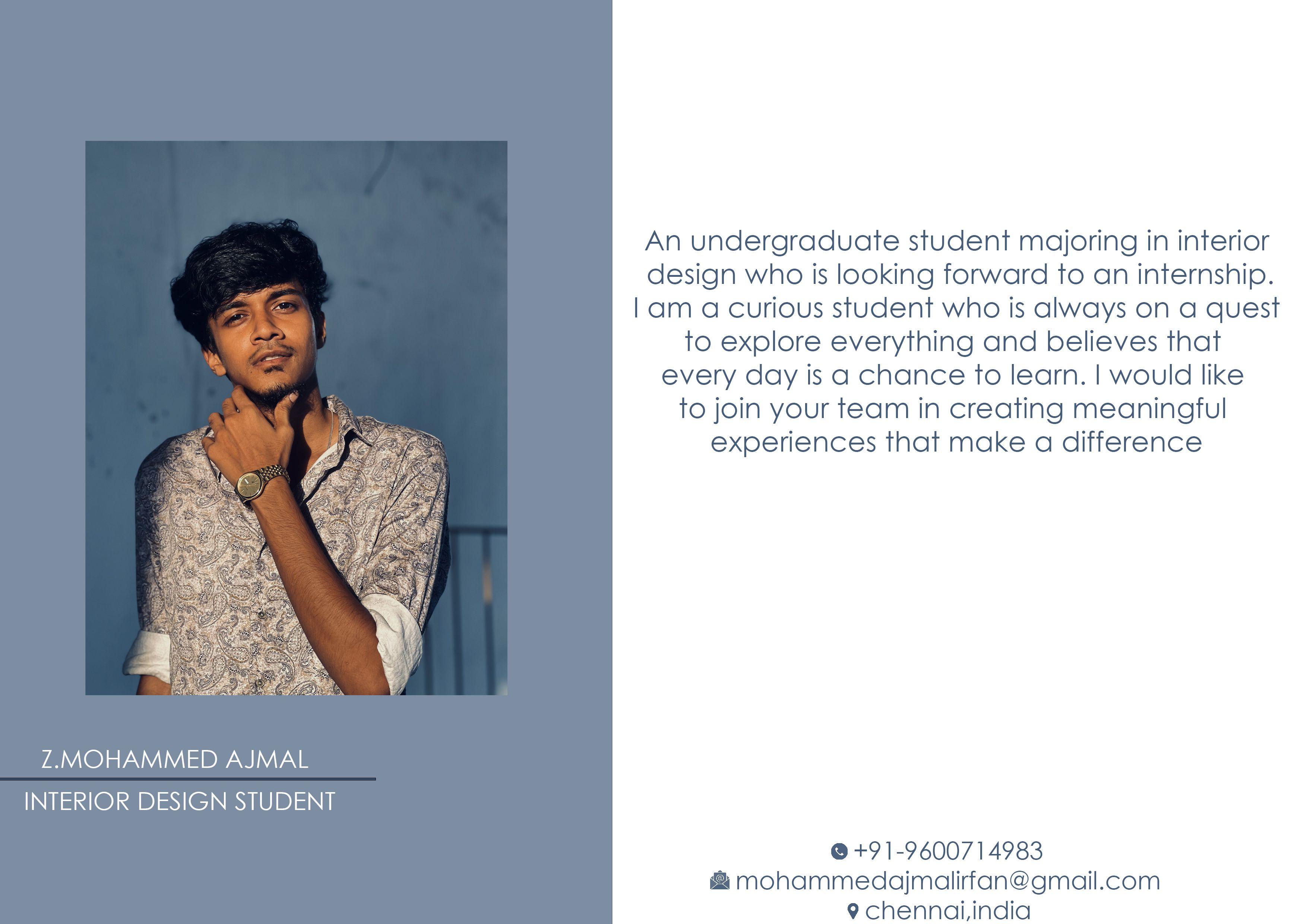 An undergraduate student majoring in interior design who is looking forward to an internship. I am a curious student who is always on a quest to explore everything and believes that every day is a chance to learn. I would like to join your team in creating meaningful experiences that make a difference