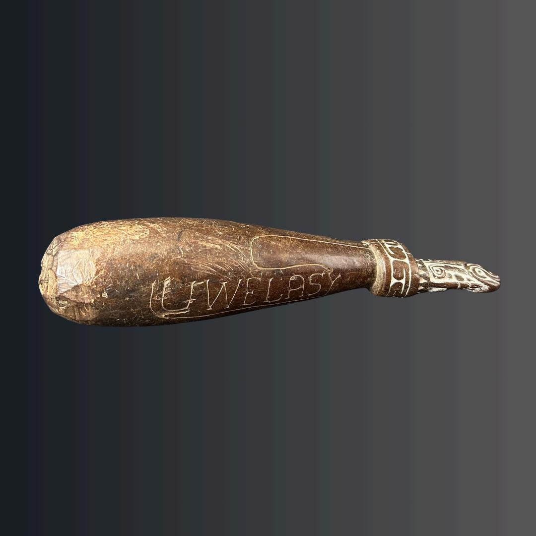 A SCULPTOR’S HAMMER, OR KAITUTU. ACCORDING TO HARRY BERAN, THE HANDLE IS CARVED TO REPRESENT THE PROW ORNAMENT OF THE MASAWATYPE CANOE IT HAS THE NAME “UWELASY” DEEPLY INCISED INTO ONE SIDE.