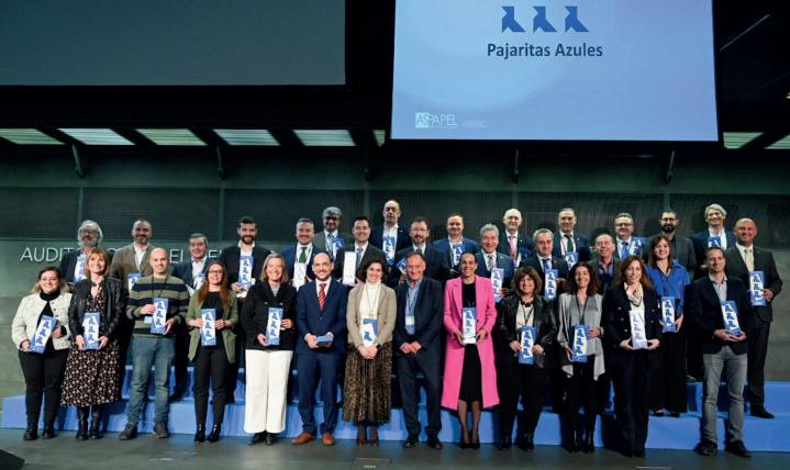 En el acto de entrega de las PajaritasAzulessepusieronderelieve las altas tasas de reciclado, cercanas al 80%, que re ejan que la ciudadanía confía en los productos y envases de papel y cartón y participa activamente en cerrar el ciclo, alargando la vida de las bras de celulosa. Estos galardones se conceden a partir de la evaluación de 21 indicadores anuales que analizan todos los aspectos que atañen a la recogida del contenedor azul