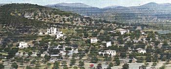 Façana principal de la masia el 1957. Es poden llegir les inscripcions “Vista Alegre” i “R. Gandol, despacho”. Imatge acolorida