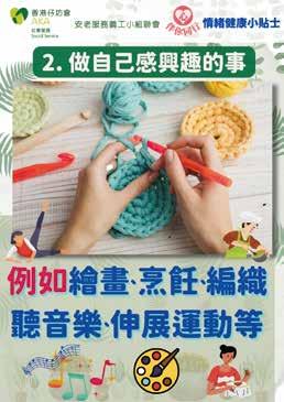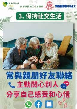展身心 同享健康 服務病有醫靠 賽馬會 門診服務資助計劃 圓滿結束 本會在香港賽馬會慈善信託基金捐助下,自2022年3 月24日開始與區內私家診所攜手推展「賽馬會『病有醫靠』 門診服務資助計劃」,在全城抗疫的同時,繼續照顧有需要人士 的其他醫療需求,為他們提供可負擔的門診服務。 本計劃之服務對象為65歲或以上長者、12歲或以下兒童、持有過去12個月內 在任何一間醫院管理局普通科門診求診證明的人士,或獲社福機構轉介有財 政困難之人士。計劃讓受惠人士在第五波疫情期間,以$50診金使用參與本計 劃的私家醫生的診症服務(包括基本診症及三日藥物)。香港賽馬會慈善信託基 金會為每名受惠人士津貼$250,餘下成本由診所承擔。 由於反應熱烈,3,000個服務名額經已爆滿,故計劃提早於8月上旬完結。無 論是受惠的人士或參與計劃的10位醫生,對本計劃能有效處理新冠肺炎以外 的醫療需求,均有給予高度評價。更有參與的醫生反映,計劃能鼓勵患者早 日求診,獲得適切的治療,甚具意義。 「心伴你同行」義工訓練及推廣精神健康訊息 本會社會服務轄下安老服務義工小組聯會夥拍扶康會康晴天地,於 2021年12月15日舉行「『心伴你同行』義工訓練日暨聯歡」。活 動集結59位來自本會5所安老服務單位的義工代表,一同參與主題 互動工作坊及「真人圖書館」,提升他們對心理健康的認識,並讓 他們有機會與精神疾病康復者交流。 完成訓練後,義工於2022年2至4月期間製作情緒健康資訊圖卡,並 於各安老服務單位Facebook專頁、會員及義工WhatsApp群組中發 放,成功把保持精神健康的訊息及減壓小貼士傳遞予1,800多人 次,於疫情中帶出正能量,服務及回饋社會。 10 私家醫生/診所