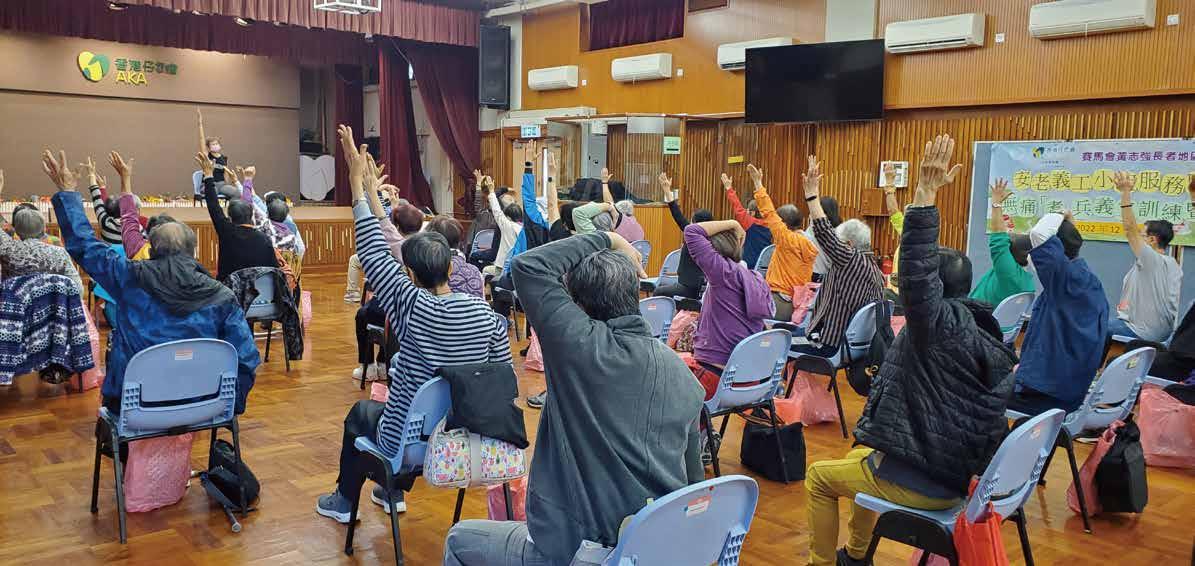 其中,安老服務義工小組聯會於2022年9月的季會中與小組成員分享了南區長者大數據 庫的初步分析結果,顯示不少長者深受痛症困擾。聯會經討論及投票後,選定以「紓緩 痛症」為12月的訓練主題,並於12月初舉辦「無痛『耆』兵義工訓練」暨聯歡活動, 由專業瑜伽導師教授運動,緩減參加者受痛症困擾的情況。訓練完成後,小組聯會成員 更將所學拍成短片於網上平台發放,與更多有需要坊眾分享緩痛運動,改善生活質素。