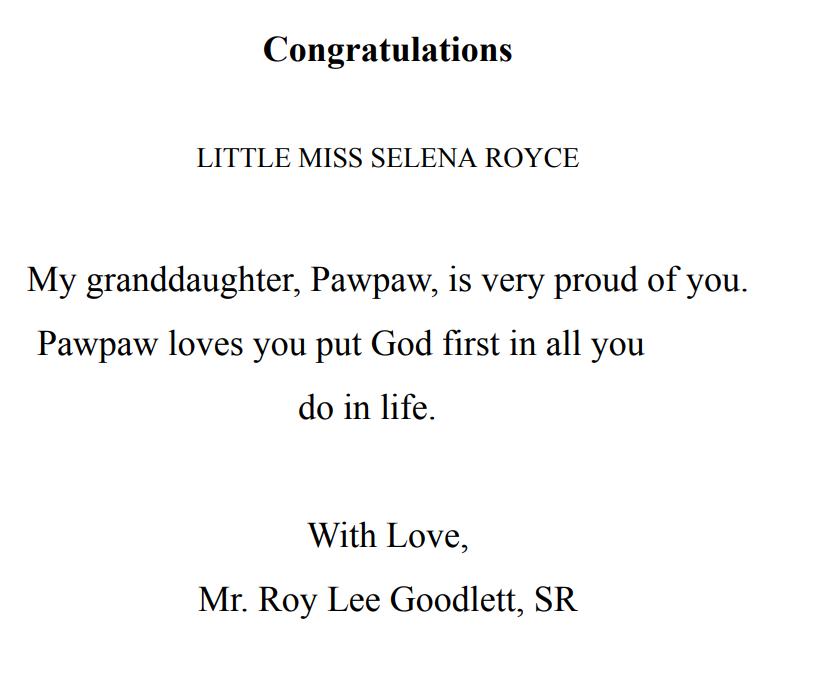 Best wishes to Selena Royce Mrs. Jackie Hillian