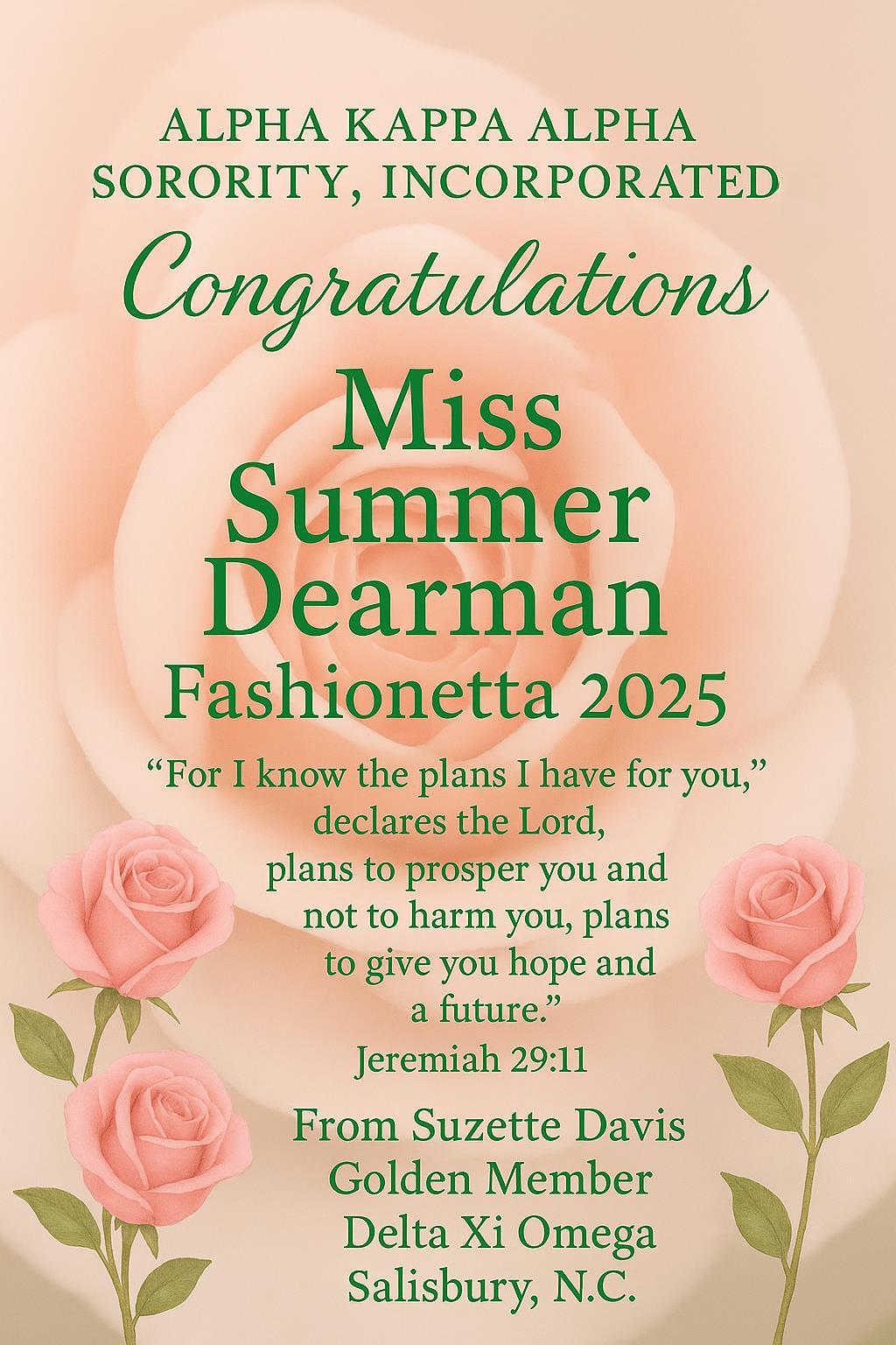 To the Salisbury Rowan community, Delta Xi Omega Chapter of Alpha Kappa Alpha Sorority, Inc ®., is pleased to present our annual FASHIONETTA ® . The FASHIONETTA ® is a nationally trademark program of the Alpha Kappa Alpha Sorority. The 2025 FASHIONETTA® is an opportunity for young girls in grades three to eight to develop social skills, participate in community service and showcase their talents. Registration started in January and the sessions concluded in June. There were a variety of sessions and the girls were exposed to different activities; one such activity was our first Career Fair in which professionals educated our youth on their careers. Each year a session is held on dental hygiene in which they learn important facts about caring for their teeth.