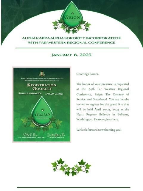 January 6– "Get ready to REIGN!" Registration is now live for the 94th Far Western Regional Conference hosted by the Pacific Northwest Cluster held in Bellevue, Washington at the Bellevue Hyatt from Thursday, April 20th – Sunday, April 23 Check your email for conference registration and hotel information. We will be voting on our FWRC delegates at our February Chapter meeting. I encourage you to submit your name for consideration. Delegates will receive a $300 stipend and are expected to attend all business meetings and submit a delegate report.