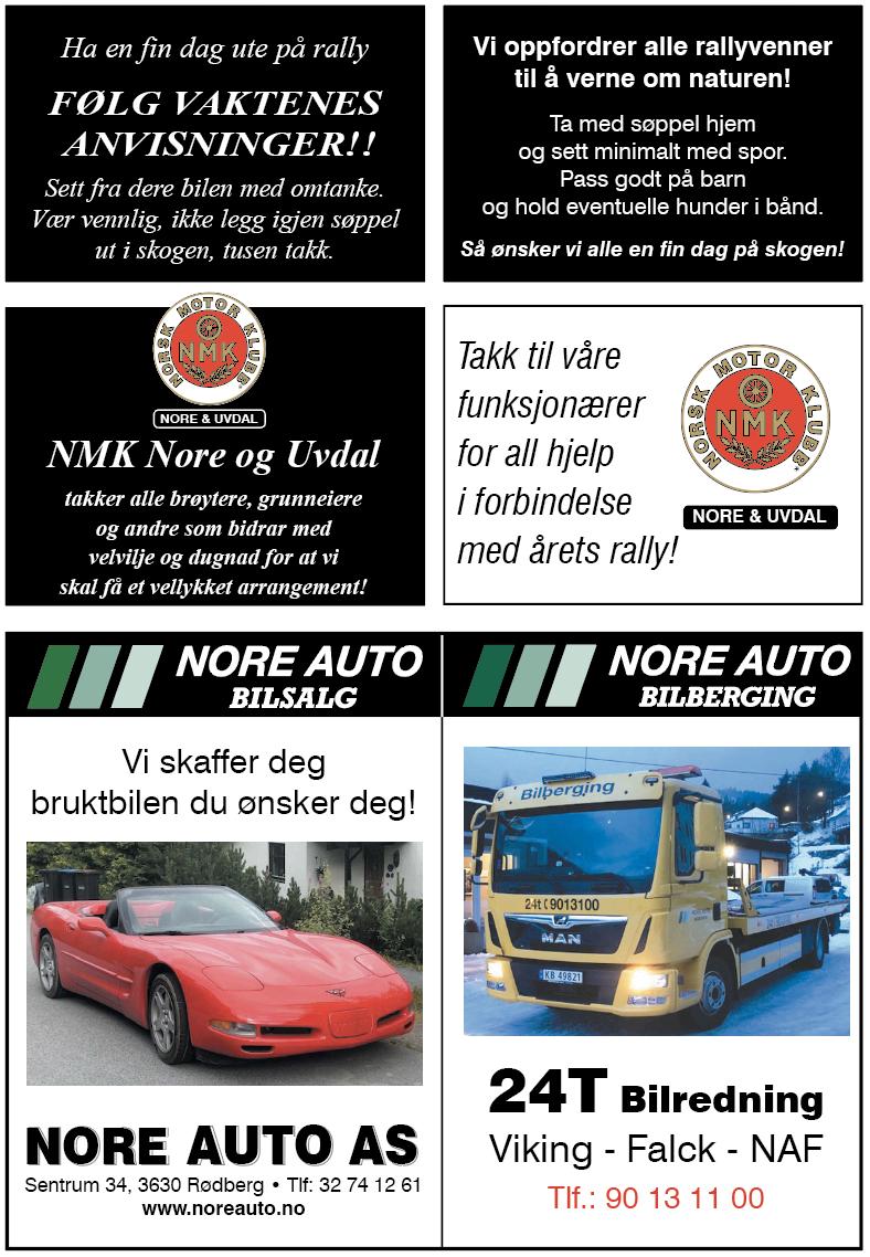 Innhold 5 14 15 16 17 18 20 Startlister Kart Fartsetapper De fire klassene Publikumsområde Stenging av veien Rallyvettregler NMK Nore og Uvdal takker for lån av lokaler for gjennomføring av teknisk kontroll Vi takker Kiwi for frukt til