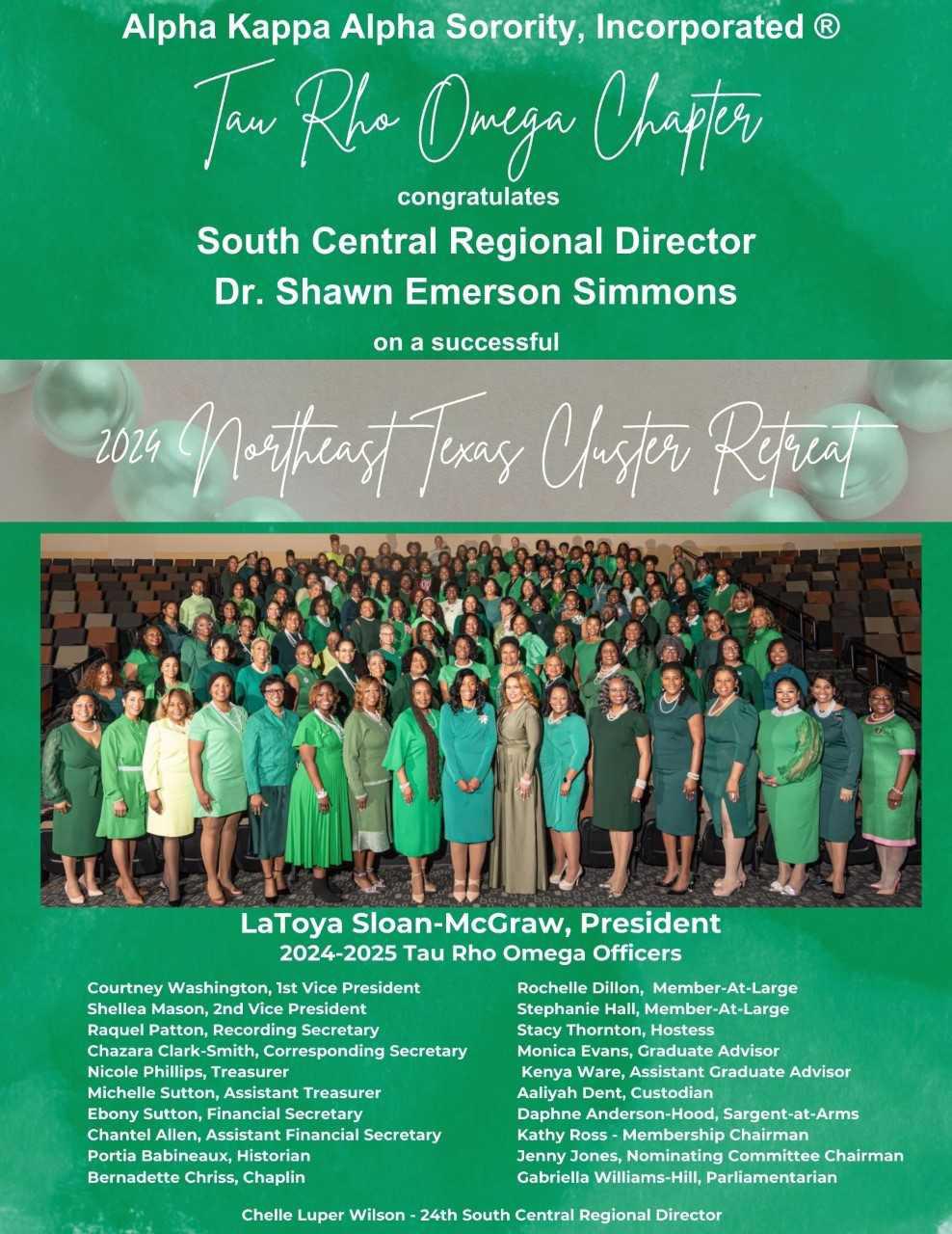 There is no place like home! It is always a pleasure to be in company with our Sensational South Central Regional Director, Soror Shawn Simmons, and the sorors of the BEST Cluster in all of Alpha Kappa Alpha Sorority, Incorporated®—the Northeast Texas Cluster. I extend my heartfelt congratulations to Madam Regional Director on a successful first Northeast Texas Cluster. Kudos to Soror Tamika Tutt, Cluster Coordinator, conference planning team, and the host chapter, my chapter, Tau Rho Omega on the phenomenal planning and execution of this conference.