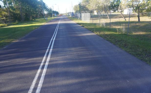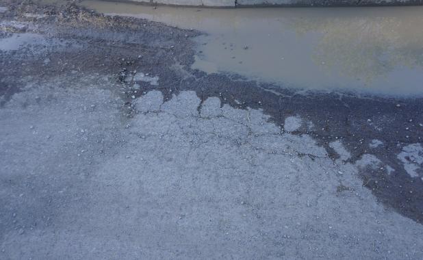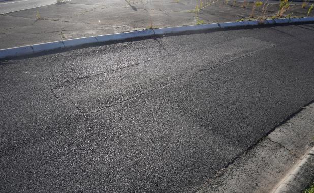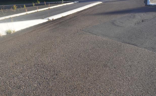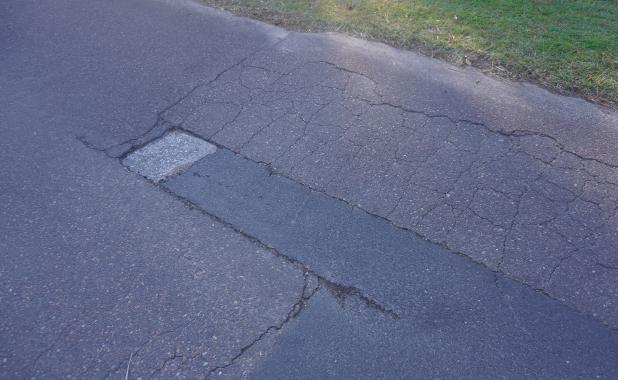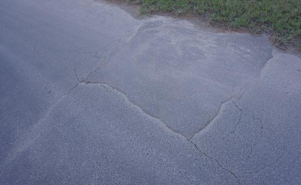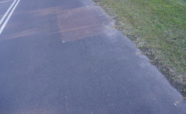 42 Patching and cracking in the south side of the roadway on Station Road, on the east side of the entrance gate.