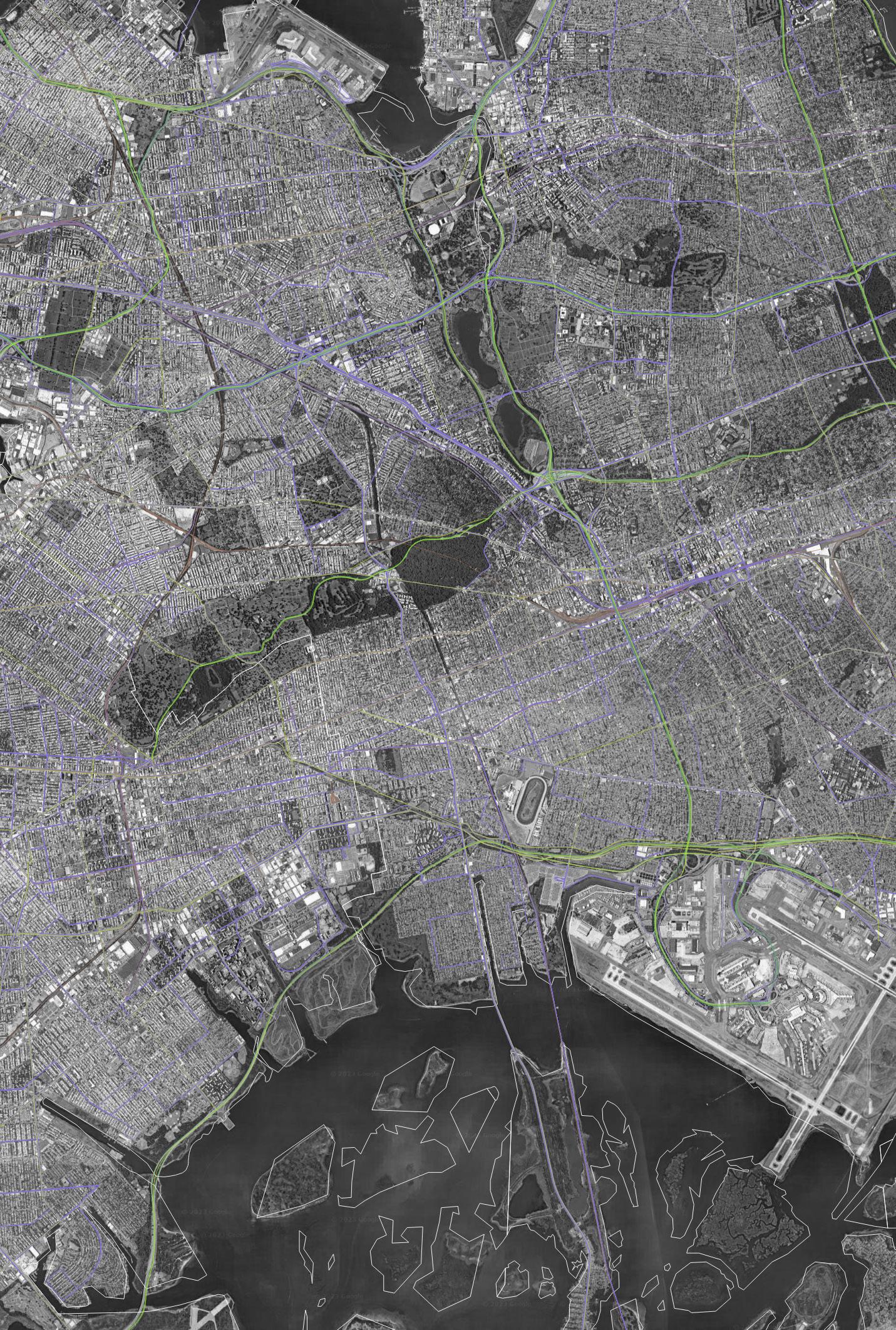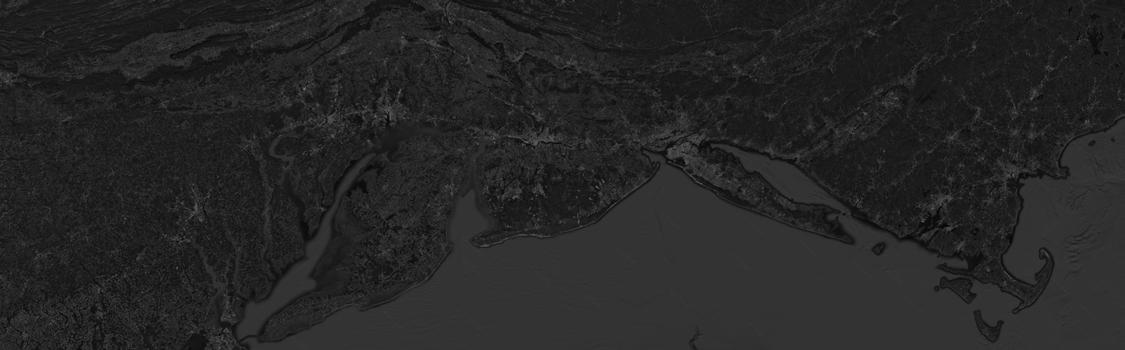 Using the US Government’s public infrastructure databases, the white lines show the network of primary roads, also allowing us to understand which areas throughout the seaboard are crtical in vulnerability (denser regions of roads) with respect to potential destruction.