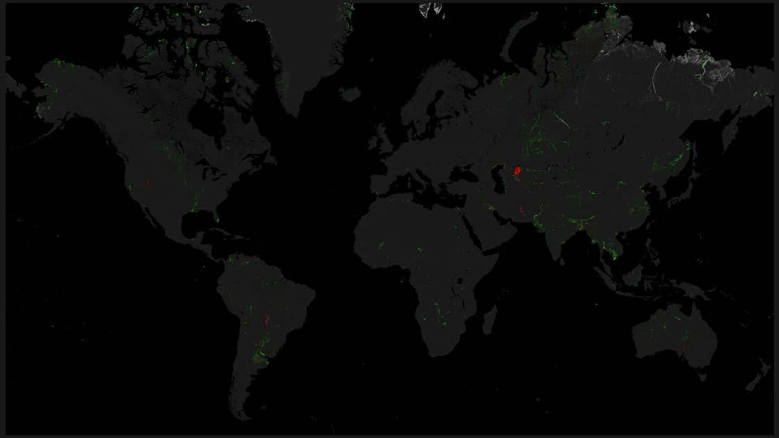 For precise quantification, a buffer zone is considered to accommodate the ambiguity of moderate changes that are closer to the mid-point, which is represented by black (value 100). Red values ranging from 0-75 encapsulate a marked decrease in water occurrence, including a buffer zone to ensure that even less intense but still significant decreases are accounted for. Similarly, green values from 125-200 are chosen to represent an increase in water occurrence, excluding the immediate vicinity of the neutral black value to focus on more pronounced changes.