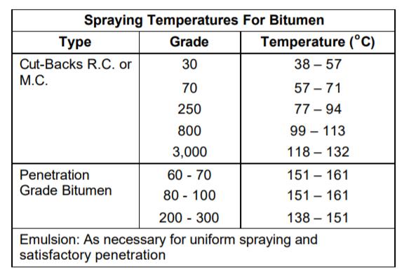The bitumen used should either be cut back bitumen RC 30, RC 70, or rapid setting emulsion and this should be sprayed within the temperature range.
