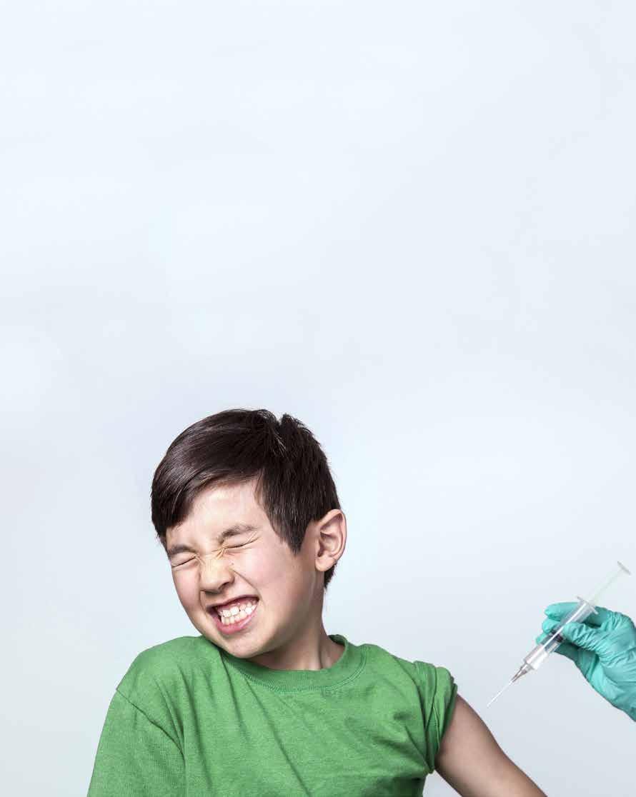 Journal of Plastic Surgery—may compete with the pain, making it practically unnoticeable. This method apparently works because upon the initial cough, blood pressure is momentarily increased, and hypertension is known to reduce pain perception. For the full e ect, it’s important for the cough to coincide with the shot. If there are multiple injections, a cough can be repeated for each. take it easy. Lindsay Uman, Ph.D., a clinical psychologist at IWK Health Centre in Canada has noted the parallel between parental behavior during vaccinations and the amount of pain and anxiety their child experiences at a doctor’s visit. If you relax, maybe they will, too. She explains that a simple “it’s OK” or “don’t worry” is often enough to put a child’s mind at ease. If your child is simply having a tantrum, stepping out of the room to allow the nurses to do their job may help. Some children, however, su er from a more serious fear of needles and may need more reassurance. Hold or hug them in a comfortable position. Most pediatricians will accommodate the situation to the best of their ability. For example, instead of administering four separate shots by one nurse, two nurses could administer the shots simultaneously, resulting in two pricks instead of four.
