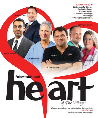 We are accepting new patients into the practice. 352.674.2080 1149 Main Street, The Villages Follow your heart BOARD CERTIFIED IN • Cardiovascular Disease • Electrophysiology • Echocardiology • Nuclear Cardiology • Phlebology • Vascular Interpretation