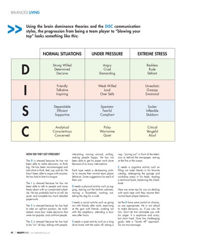 interacting, moving around, smiling, making people happy. He has not been able to get his paper work done because of so many interruptions. Each type needs a de-stressing activity to resume their normal team player behavior. Some suggestions for each of them are: D needs a physical activity such as jogging, tearing out the kitchen cabinets, moving a flowerbed, working out, taking the dog for a walk.