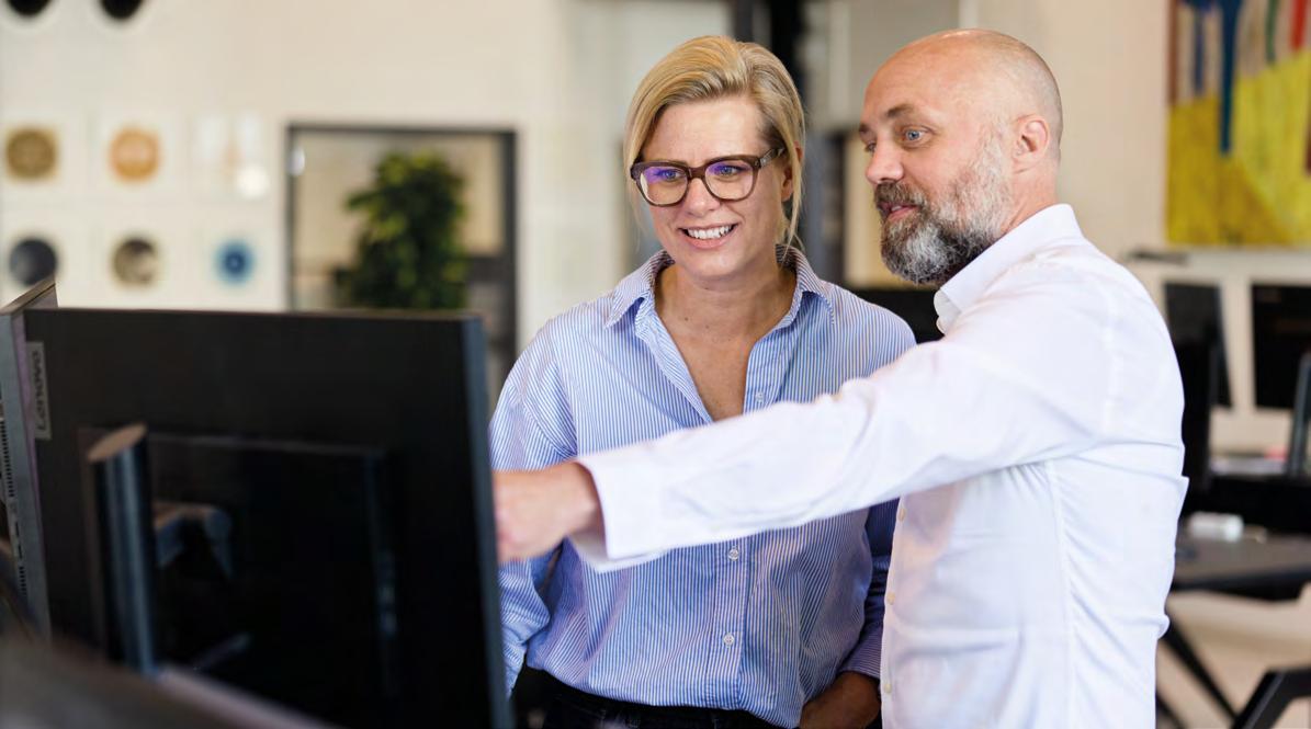 Bæredygtighed er en integreret del af projektudviklingen i AKF. Her deltager Emilie Karlsbad, senior projektudviklingschef, og Christian Gjessing Bruun, ESG- og bæredygtighedschef, i et møde om et af AKF's kommende projekter.