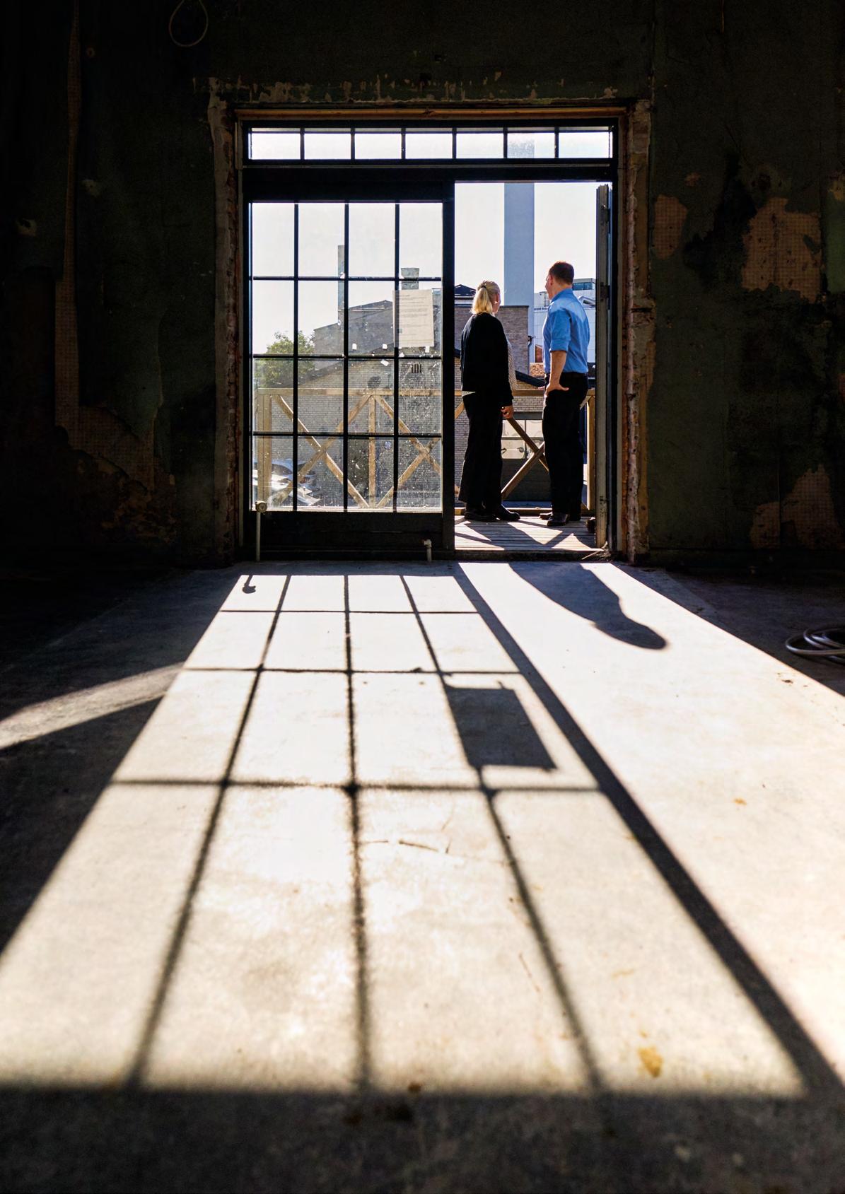To kolleger, James Dyke, chef for asset management, og Pia Sloth Frandsen, erhvervsudlejningschef, står i døråbningen til en af AKF’s ejendomme i København NV, som står foran en transformation, hvor det eksisterende danner afsæt for det næste.