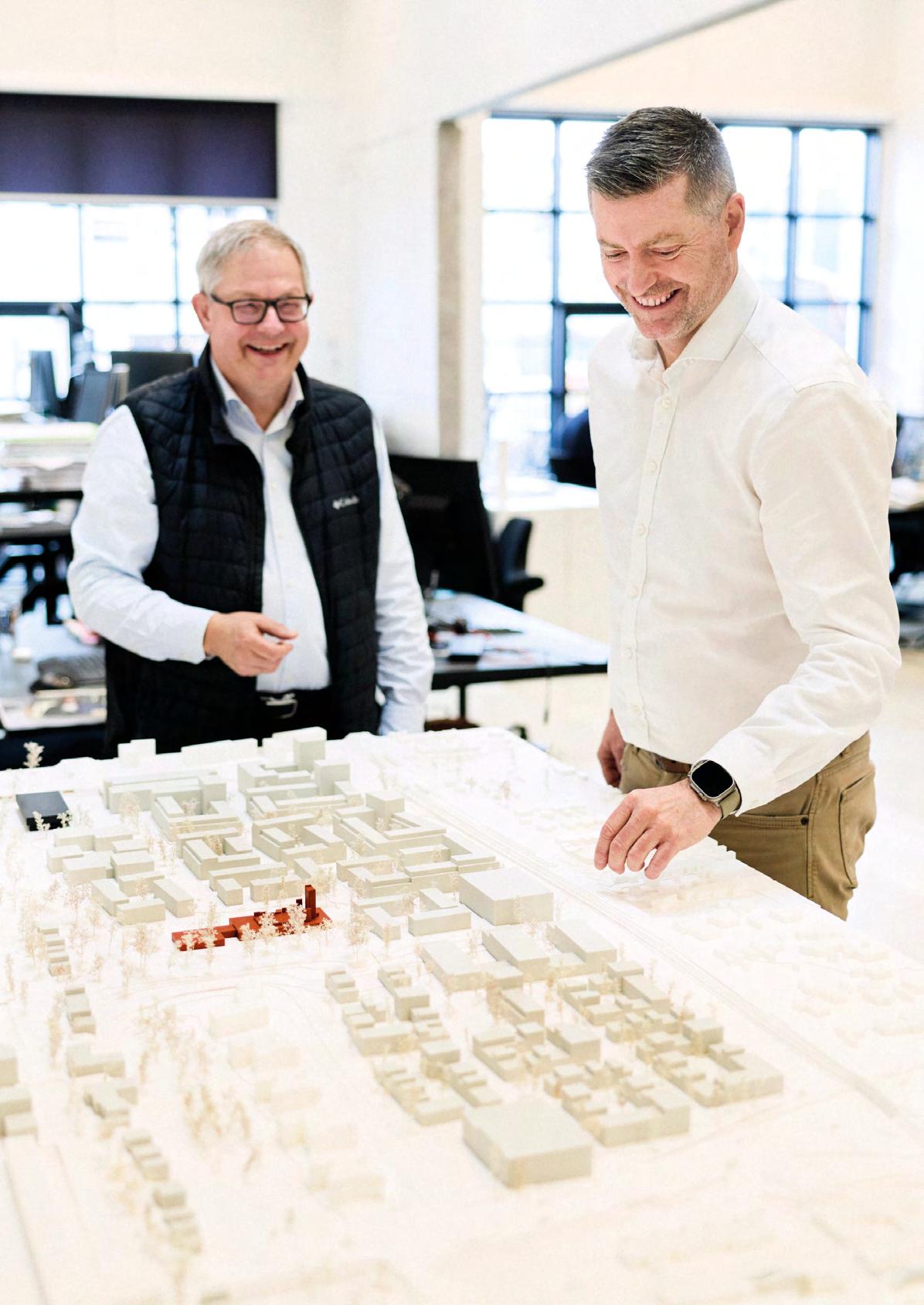 De to seniorprojektudviklingschefer Jørgen Jensen og Jann Aune foran modellen af Fremtidens Brøndby Strand, som står centralt i kontoret og minder om projektets skala og betydning.